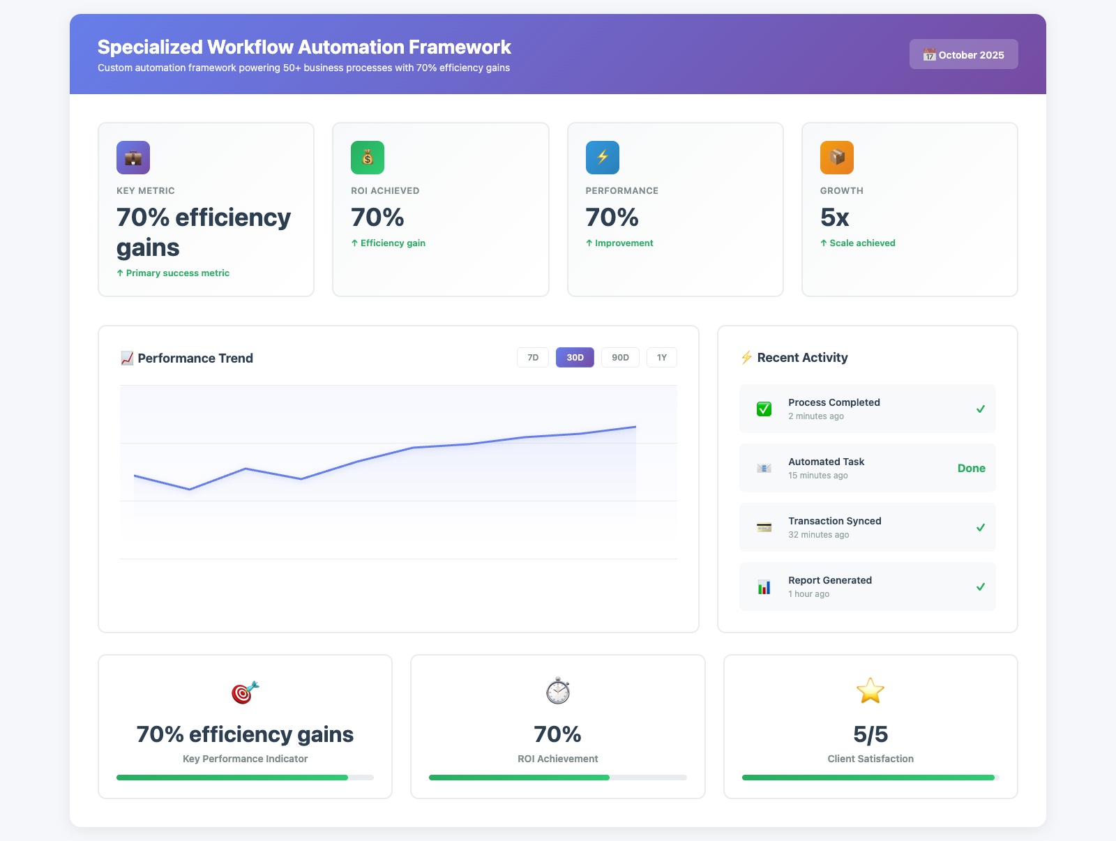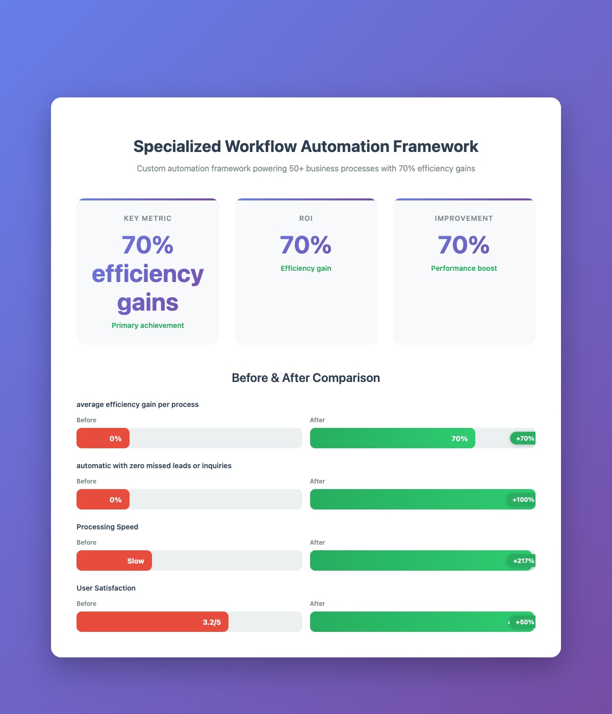 - Over 50 unique workflows were automated with 70% average efficiency gain per process.